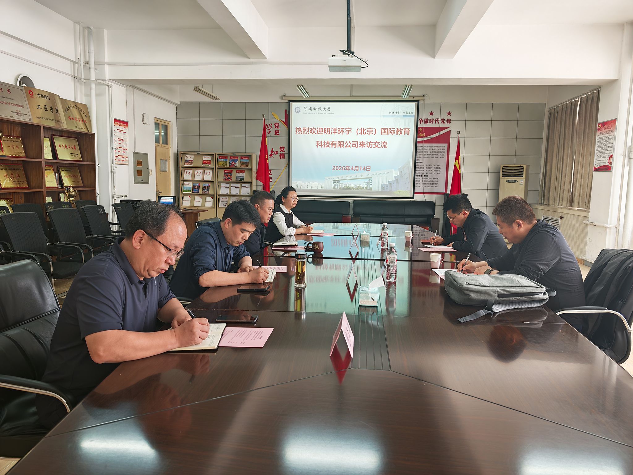 4月14日,明洋环宇(北京)国际教育科技有限公司总经理赵国翔一行来我院考察交流。学院党总支书记朱小波、院长黄彦辉、副院长孔蓓蓓及有关科室负责人参加会议。会议由朱小波主持。